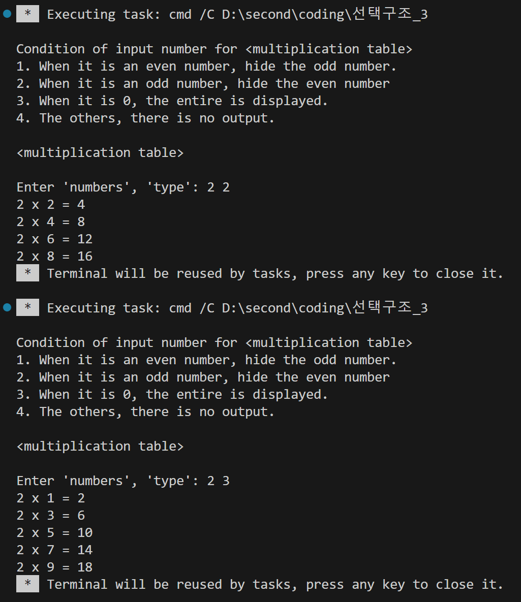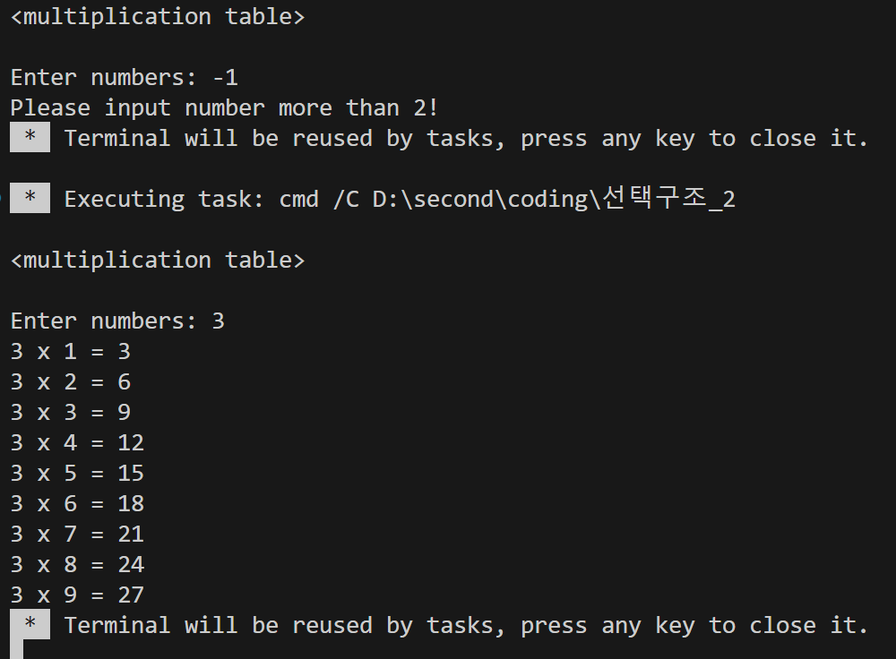 printf("<multiplication table>\n\nEnter 'numbers', 'type': ");