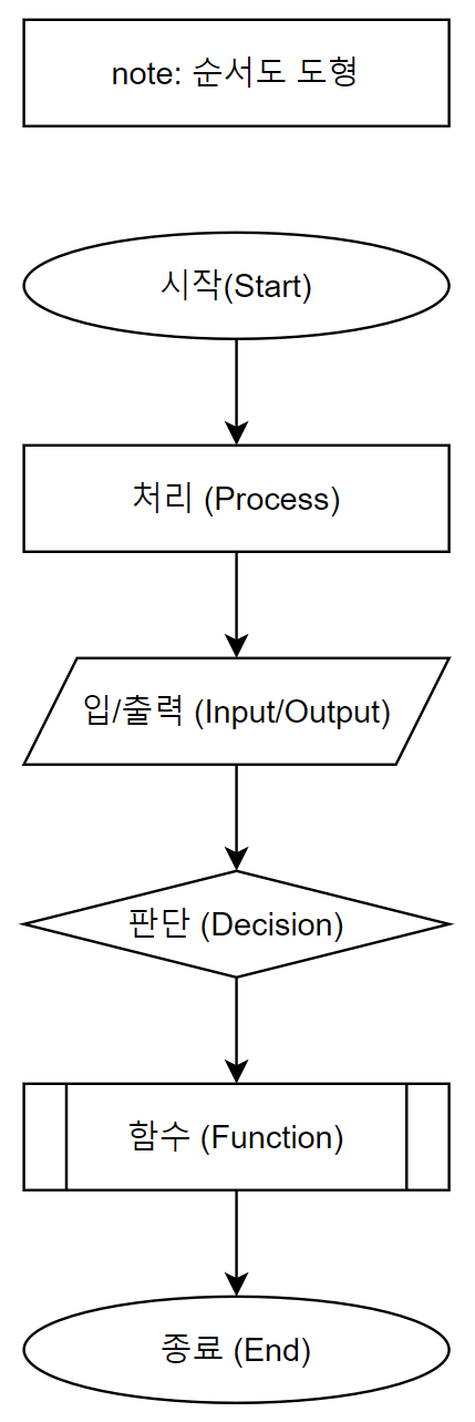 조건문의 결과에 따라 다음 실행할 작업이 결정됩니다. - 함수 (Function): 특정 알고리즘이 포함된 기능을 나타냅니다.